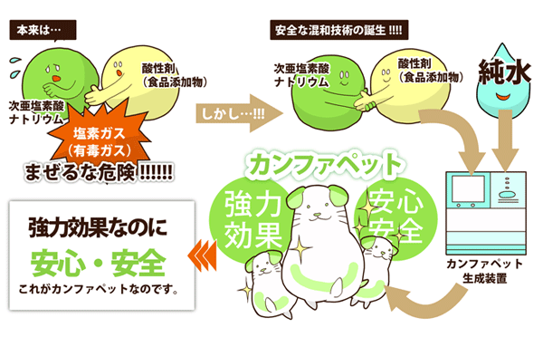しかし、カンファペットは特殊な技術で次亜塩素酸ナトリウムを害の無い状態に変えているので安心なんです。